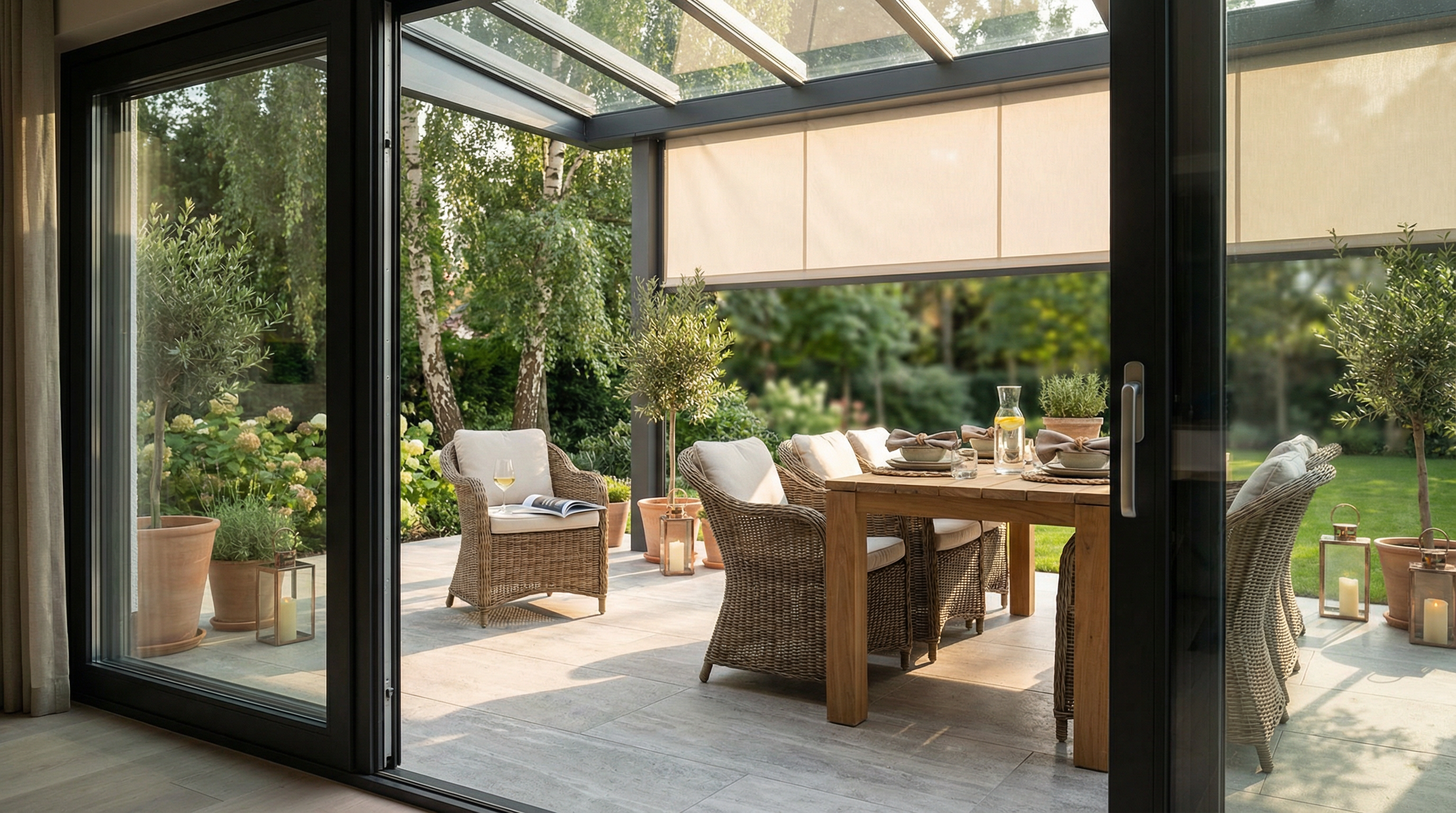 Rahmenlose Glasschiebewände verwandeln Ihr Terrassendach in einen geschützten Raum – öffnen Sie bei schönem Wetter, schließen Sie bei Wind und Regen.